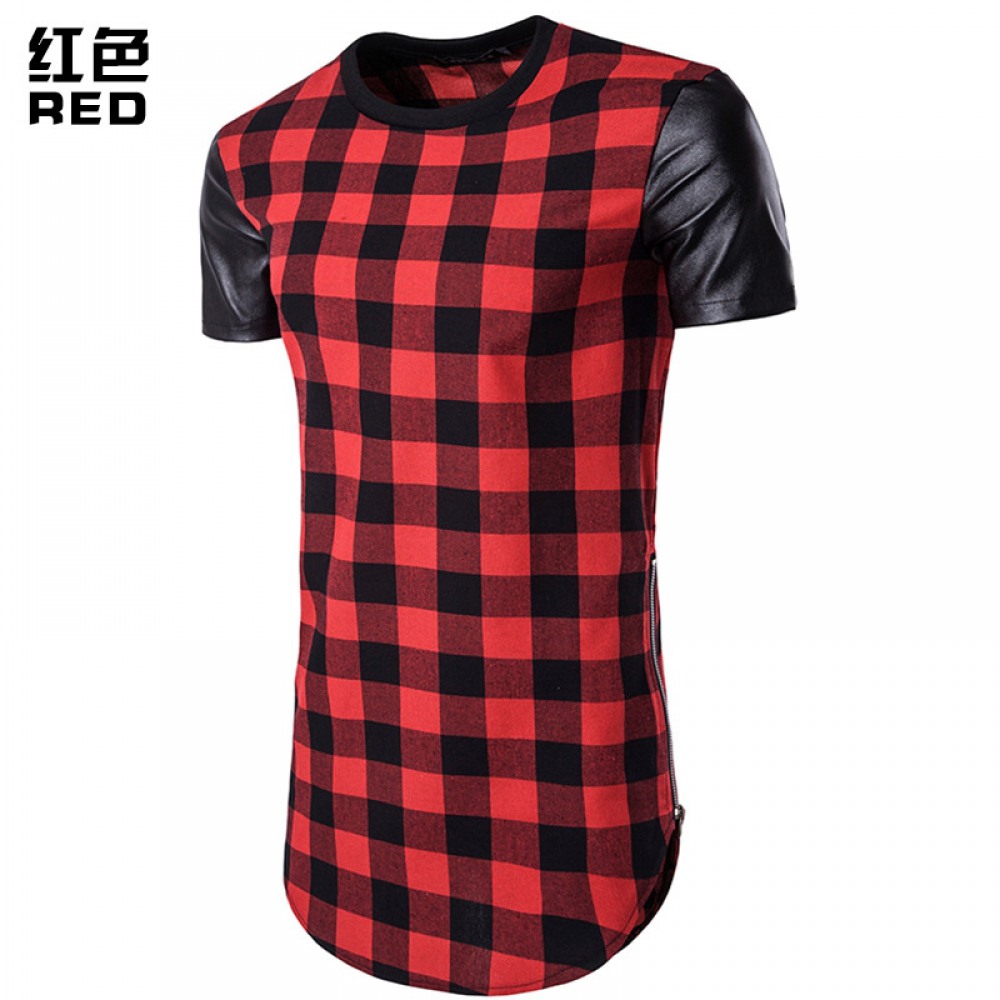 Hollow Hip-Hop High Street Men's Long Plaid Sleeves and Leather Double-Sided Zipper Arc Short-Sleeved T-Shirt