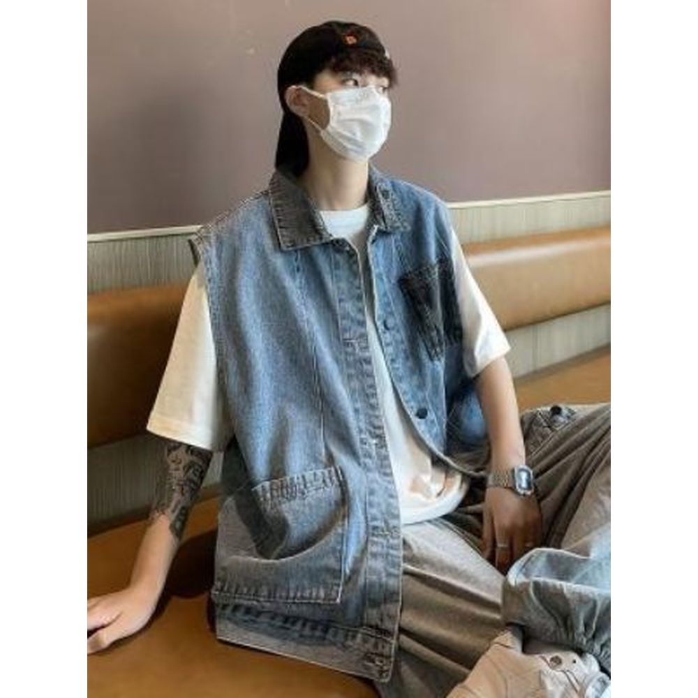 Men's Retro Colorblock Denim Vest Coat Jacket Tops