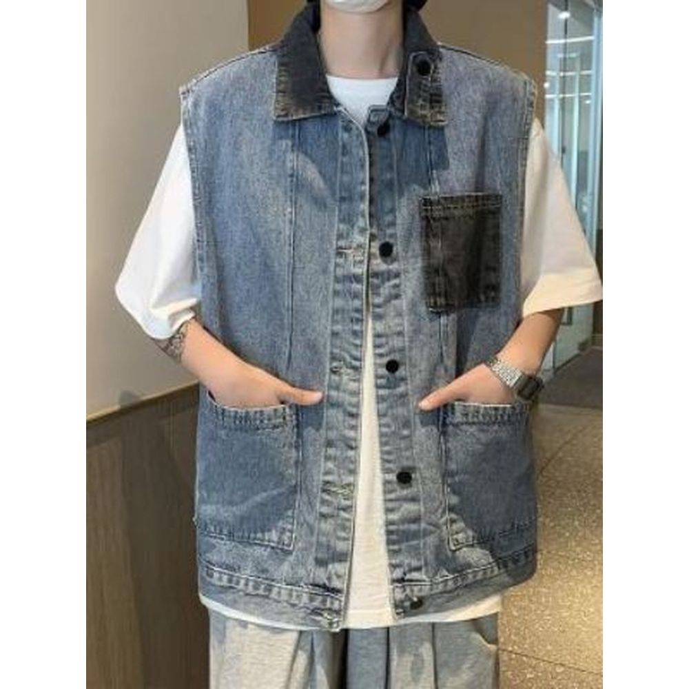 Men's Retro Colorblock Denim Vest Coat Jacket Tops