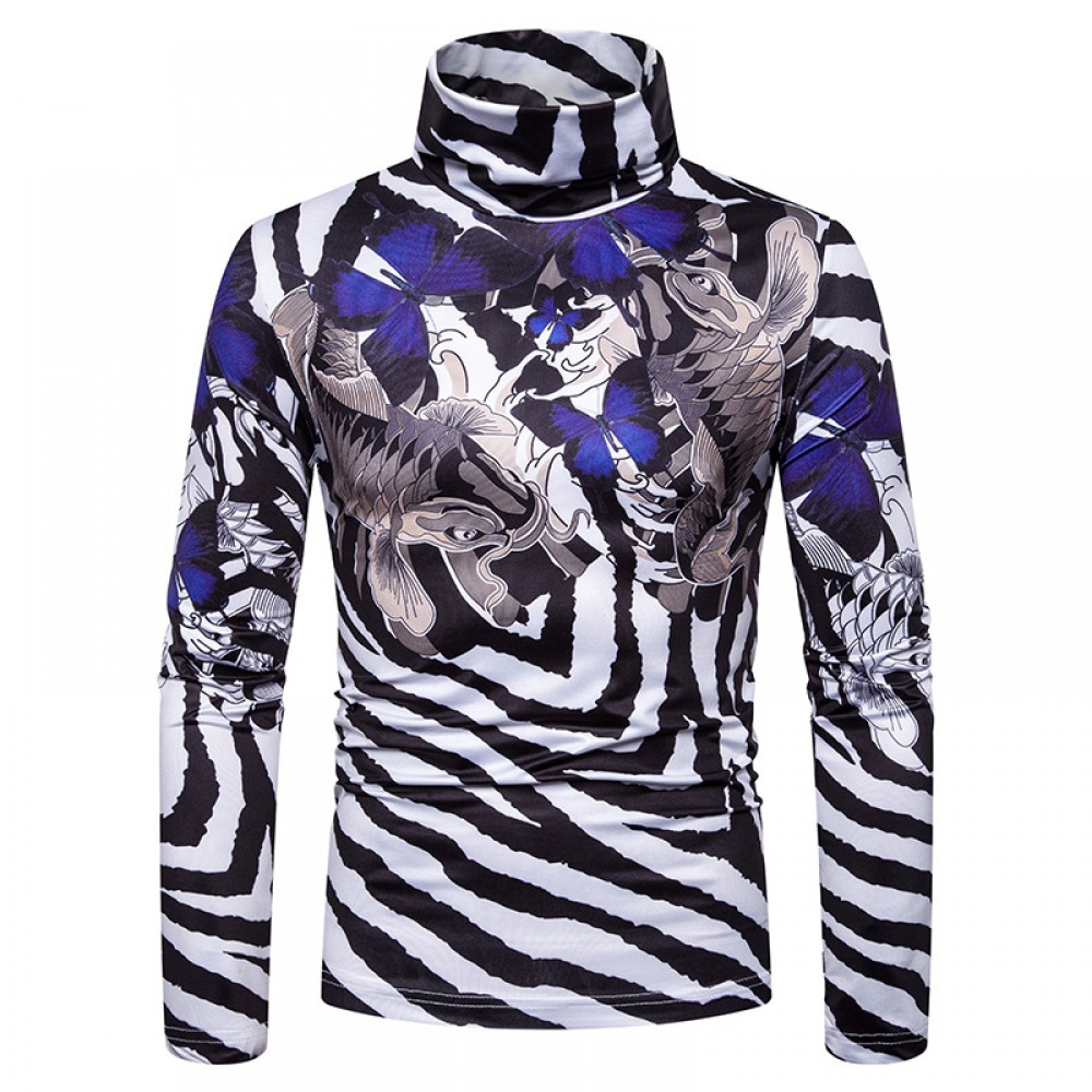 New Men's Large Size 3D Striped Carp Print High Neck Long Sleeve T-Shirt Bottoming Shirt